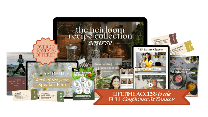 The 2025 Virtual Herbalism Conference is completely free to enjoy through the Live Event, February 16-21, 2025. You will want to join as many live sessions as you can and rewatch these illuminating conversations again and again! To do that, we welcome you to explore the VIP Access Ticket where you can get Lifetime Access to the entire conference along with a myriad of bonus material presented by this year's conference speakers AND our most-treasured Heirloom Recipe Collection Course!Â